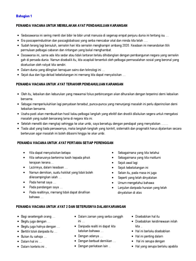 PENANDA WACANA UNTUK AYAT TERAKHIR PENDAHULUAN KARANGAN Oleh itu kebaikan dan keburukan yang mewarnai fokus perbincangan akan dihuraikan dengan terperinci demi kebaikan bersama. Kerajaan telah mengambil pelbagai langkah yang serius untuk menerapkan budaya ICT kepada. Kegiatan komuniti seperti bergotong-royong hendaklah disuburkan semula dalam kalangan remaja agar mereka dapat merasai roh dan nilai insaniahnnya secara tersirat.